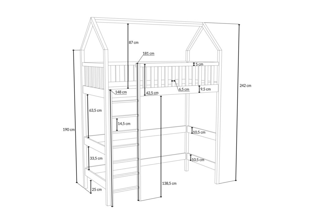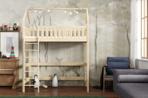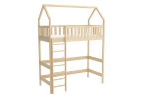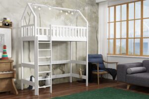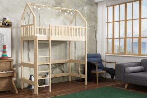 - Przeznaczenie: łóżko domek na antresoli – idealne dla dzieci, zapewnia miejsce do spania i przestrzeń zabaw pod spodem