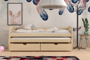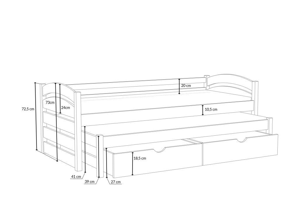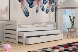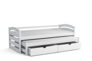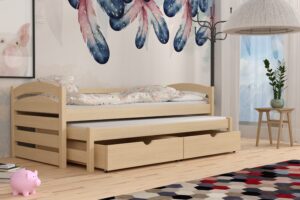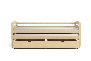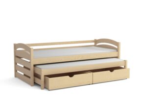 Solidna rama łóżka zabezpiecza przed upadkiem i uderzeniem podczas snu. Całość konstrukcji wykonana została z litego drewna sosnowego, które słynie z wytrzymałości i odporności na uszkodzenia. Delikatnie zaokrąglona górna część ramy zwiększa bezpieczeństwo dziecka podczas odpoczynku lub zabawy. Dodatkowym plusem tego podwójnego łóżka są szuflady, które zrobiono z drewna sosnowego, płyty meblowej i płyty pilśniowej. Ich pojemność pozwala na przechowanie kilku sztuk pościeli i dziecięcych rzeczy. Mebel pomalowany jest lakierem wodnym, który nie wywołuje reakcji alergicznych.