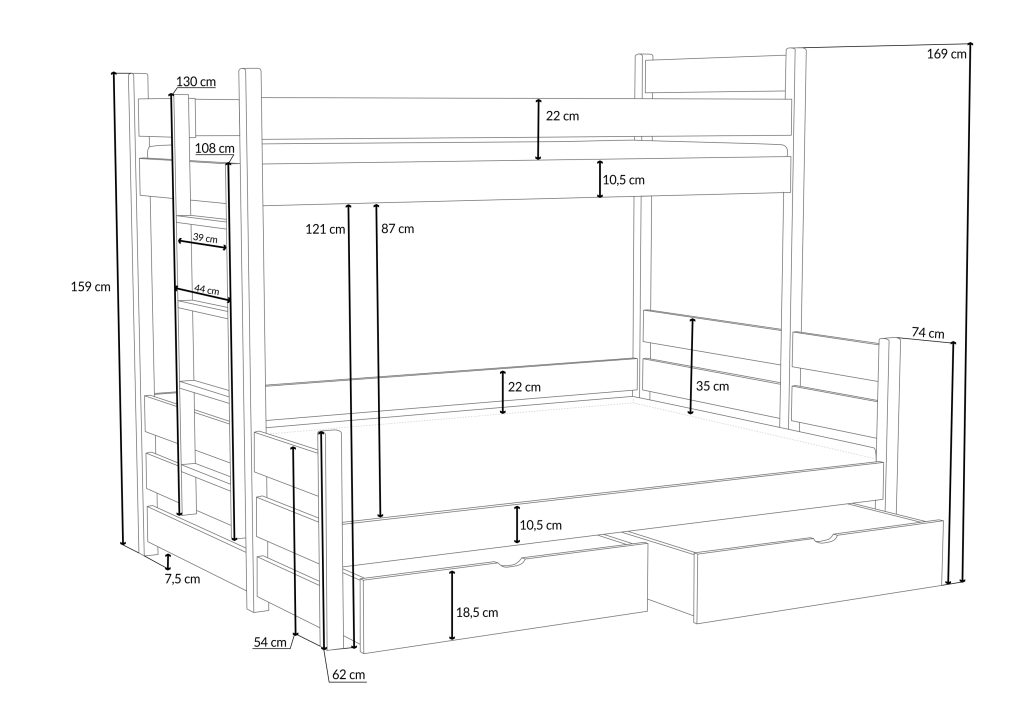 Łóżko nie ma żadnych elementów ruchomych, jednak nie musisz martwić się o to, gdzie schować pościel. W dolnej części łóżka znajdują się dwie pojemne szuflady na kółkach. Doskonale nadają się do przechowywania pościeli, a także innych rzeczy, jak ubrania czy zabawki. Są to szuflady bezuchwytowe – nie ma zatem ryzyka urwania rączki czy gałki. Jeśli jednak wolisz wolną przestrzeń pod łóżkiem, możesz podczas zamawiania wybrać wersję bez szuflad.