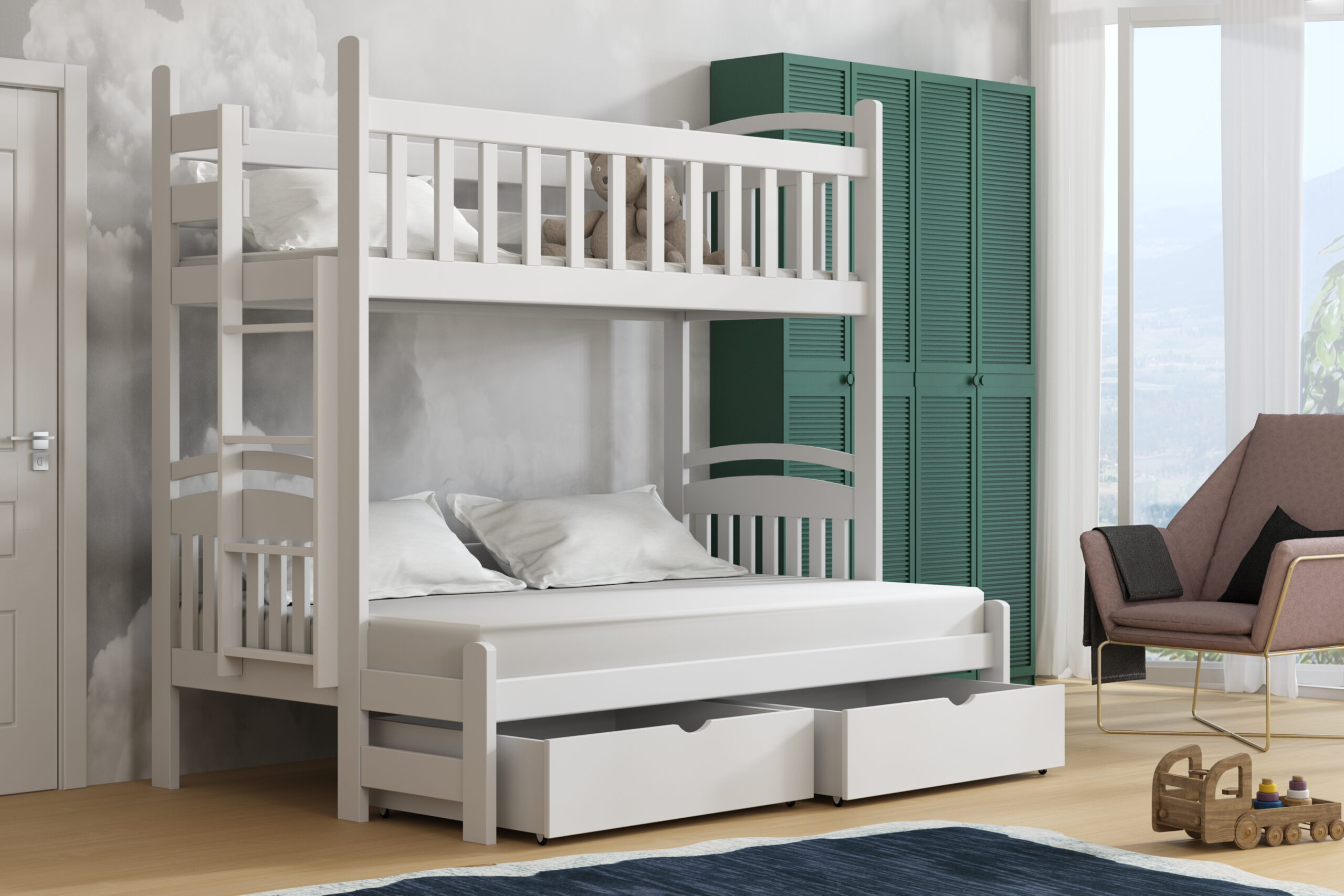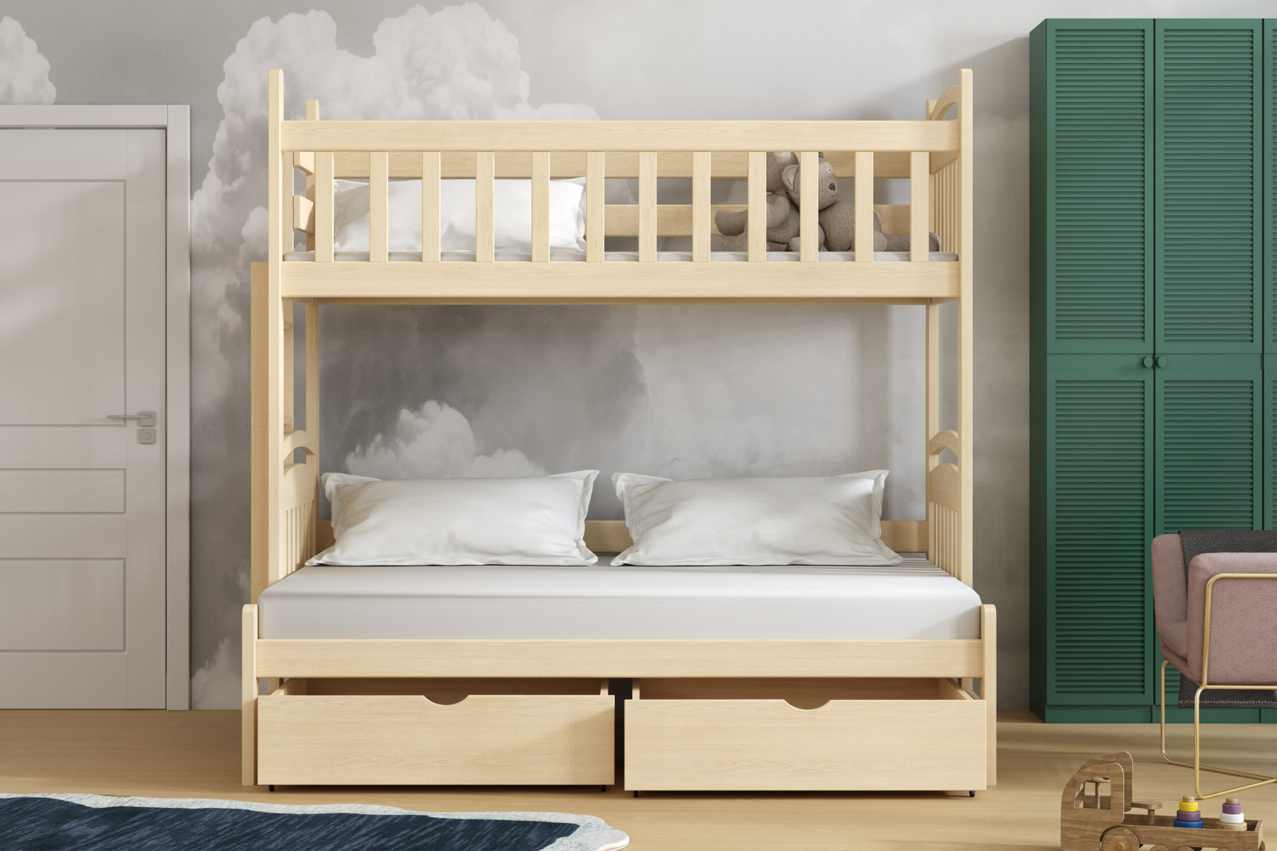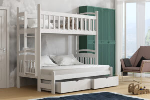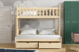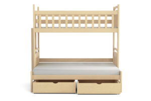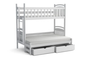Dolna część łóżka William ma dwie pojemne szuflady. Idealnie nadają się do tego, aby za dnia trzymać w nich pościel. Równie dobrze mogą posłużyć jednak i do innych celów, np. przechowywania ubrań czy zabawek. Nie mają uchwytów, a ponieważ są wyposażone w kółka, podczas otwierania i zamykania nie rysują podłogi. Pozwolą na odciążenie szafek i szaf, jednak jeśli ich nie potrzebujesz, możesz zamówić wersję bez nich, zyskując wolną przestrzeń pod łóżkiem.
