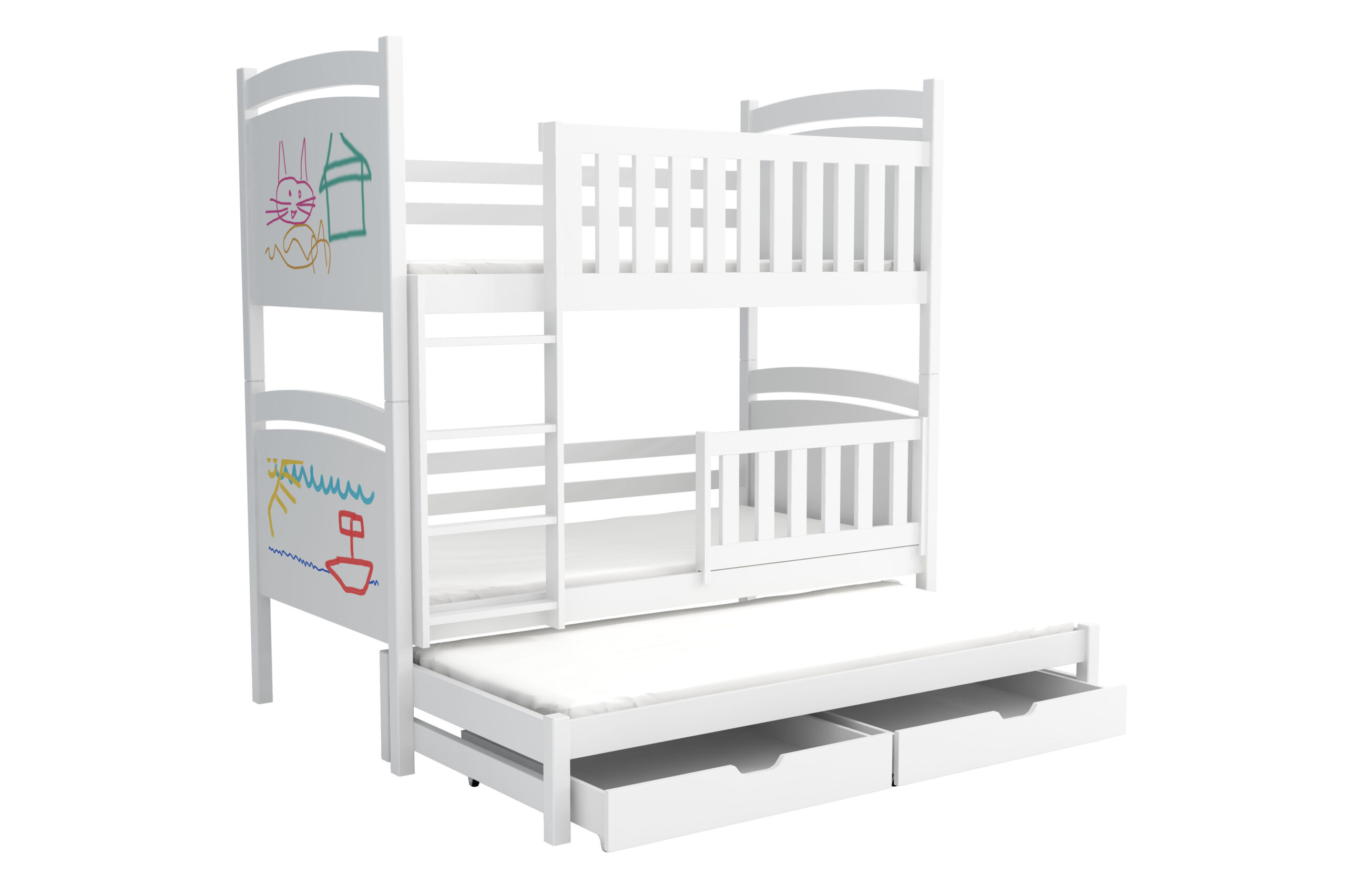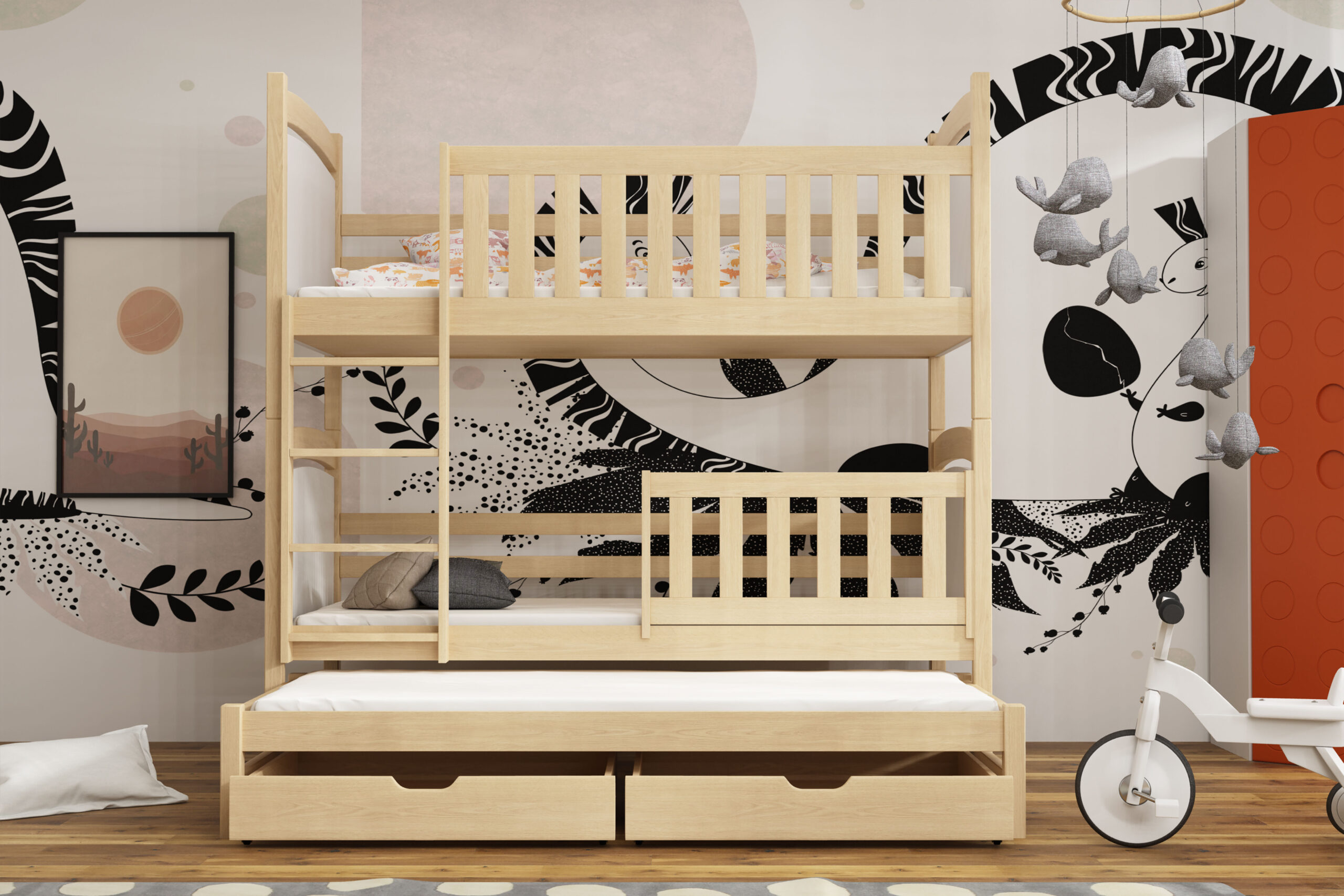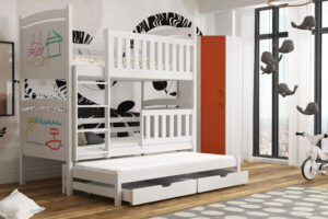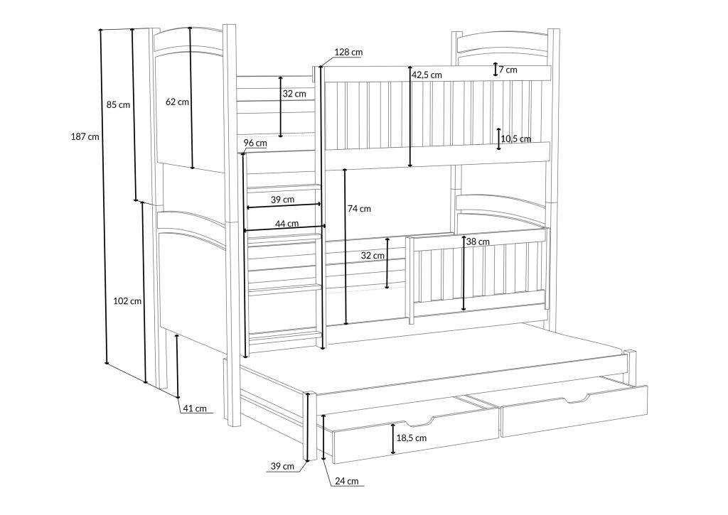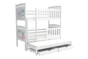 Pod dodatkowym spaniem znajdują się dwie szuflady bezuchwytowe. Z ich obsługą poradzą sobie nawet najmłodsze dzieci. Pojemność szuflad jest wystarczająca, aby zmieściła się w nich pościel, a także inne rzeczy, jak ubrania czy zabawki. To znacznie podnosi funkcjonalność mebla i pomaga w zachowaniu porządku w pomieszczeniu. Szuflady poruszają się na kółkach, dzięki czemu nie ma ryzyka zarysowania podłogi. Możesz także wybrać łóżka Charlie bez nich – wówczas zostanie pod nim swobodna przestrzeń.
