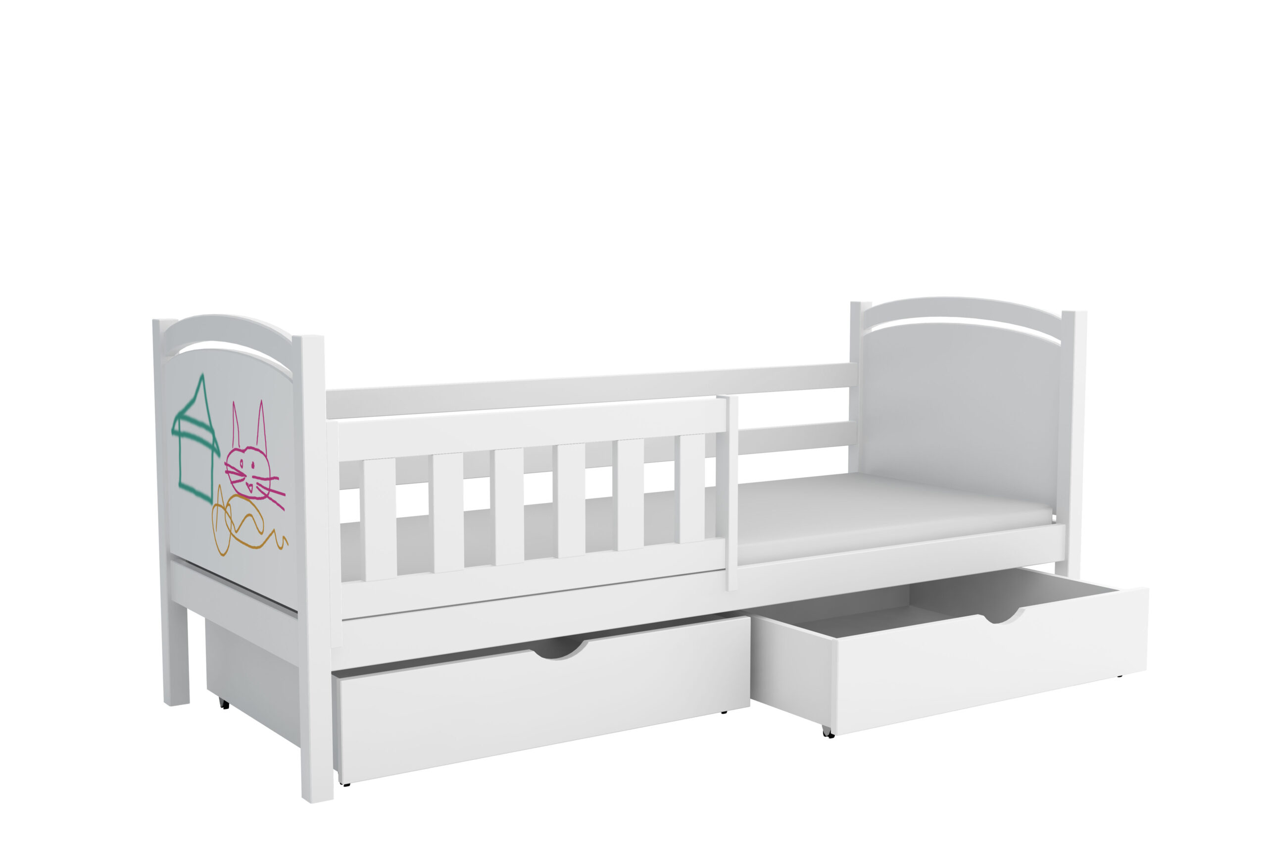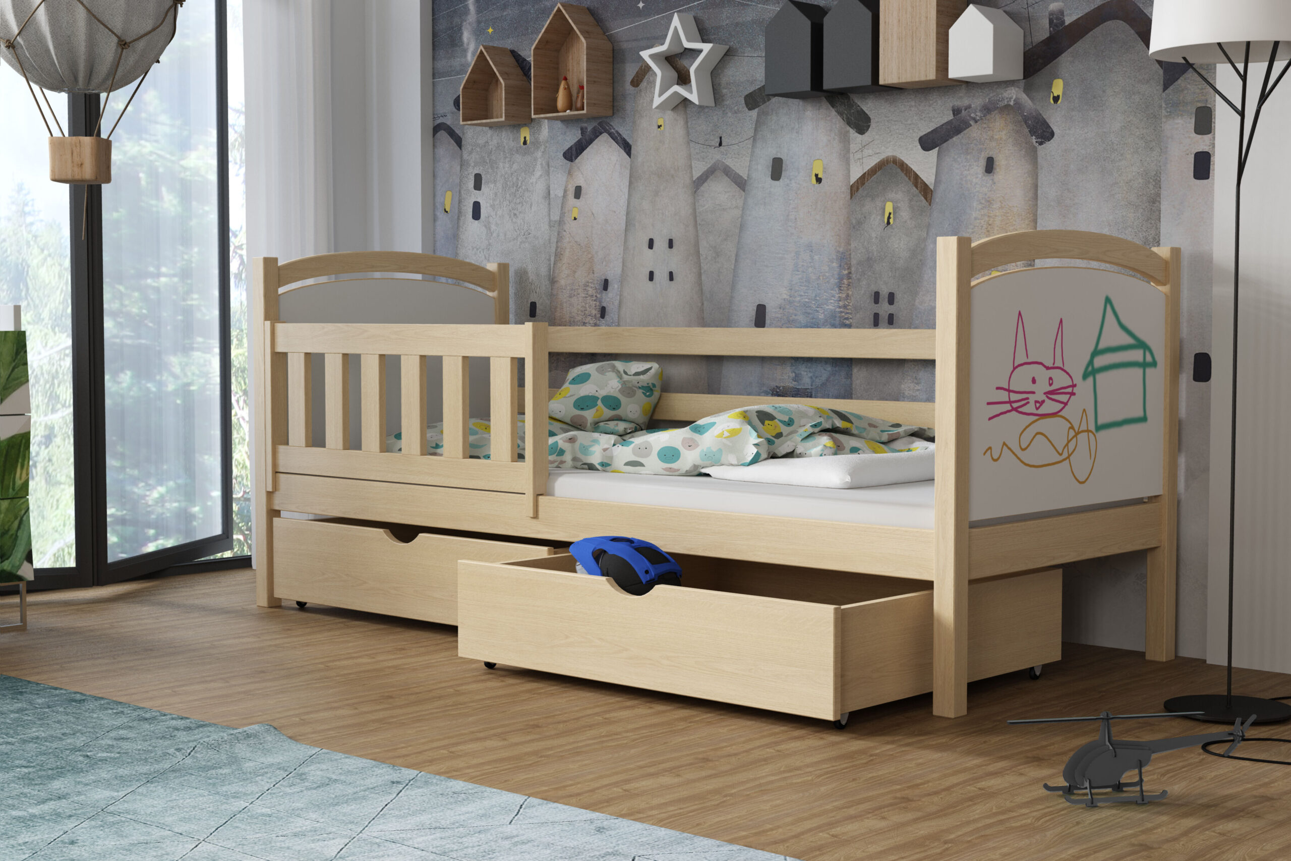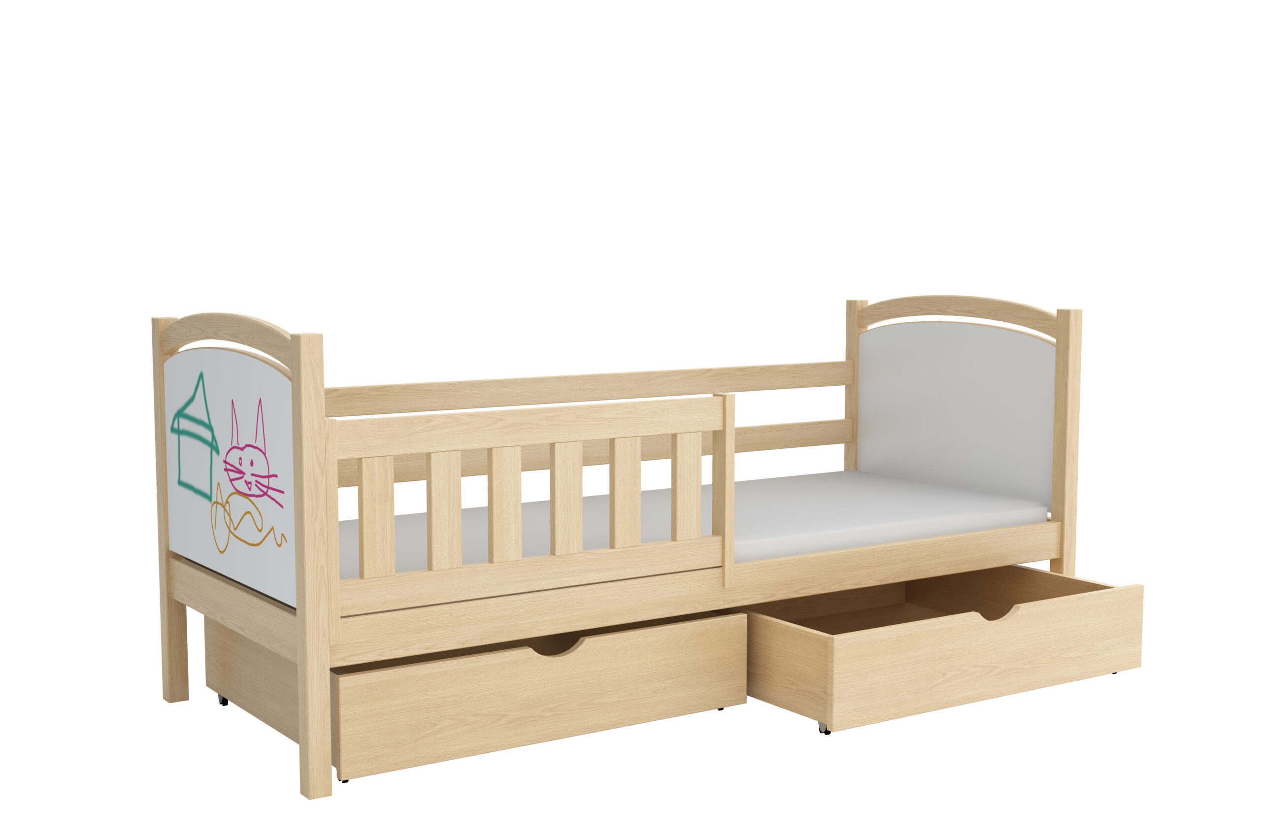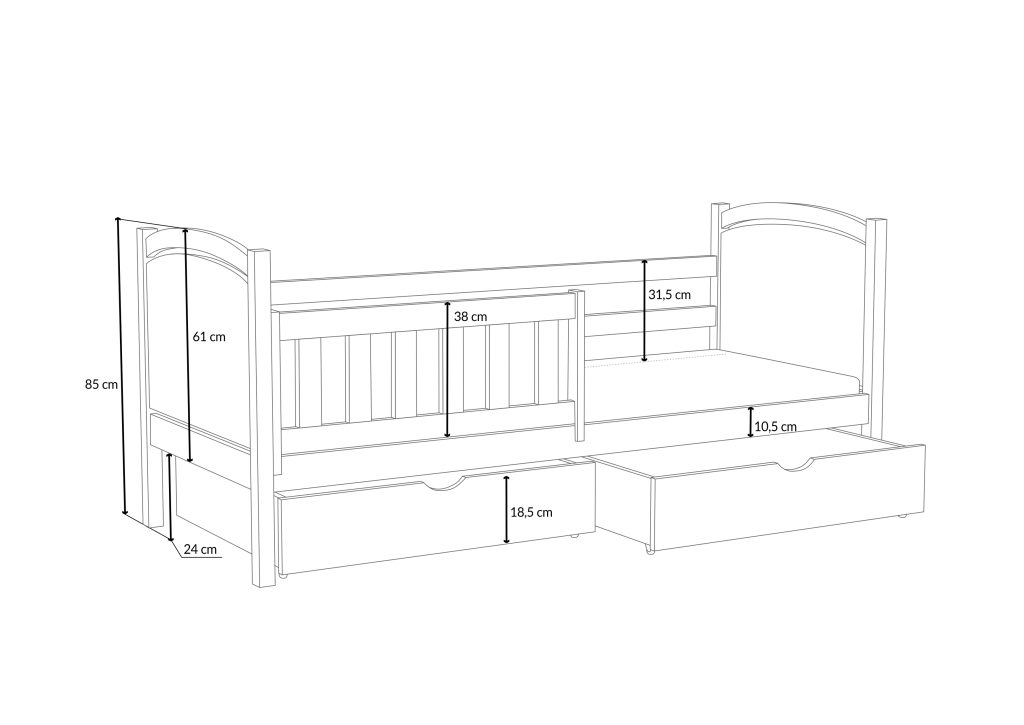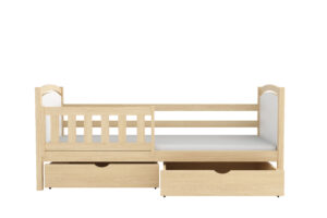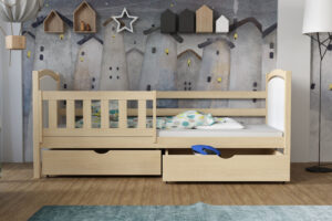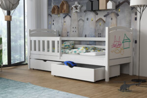 Każdy rodzic wie, jak ciężko zadbać o porządek w pokoju aktywnego dziecka. Dlatego łóżko Hania ma dwie pojemne, wsuwane szuflady bez uchwytów. Mogą one posłużyć zarówno do przechowywania pościeli za dnia, jak i stanowić miejsce składowania zabawek, bajek czy innych skarbów. To pomoże w nie tylko w zachowaniu większego porządku w pomieszczeniu, ale również nauczenia dziecka dbania o przestrzeń wkoło. Można także zamówić wersję bez szuflad – wówczas pod łóżkiem powstaje wolna przestrzeń.
